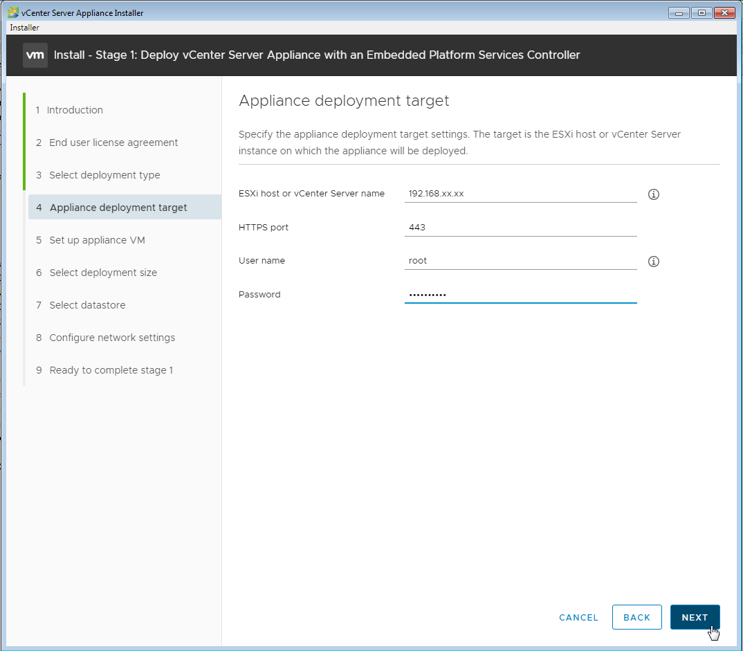 Указываем адрес хоста ESXi, логин и пароль для доступа к нему.