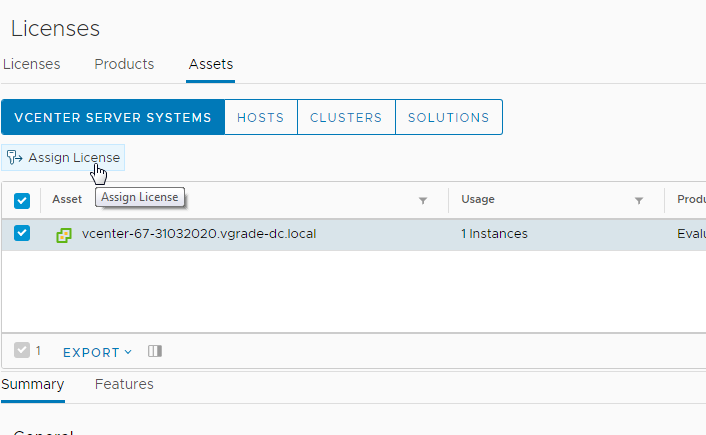 Для этого меню Assets → Assign License и выбираем vCenter, к которому нужно применить лицензию.
