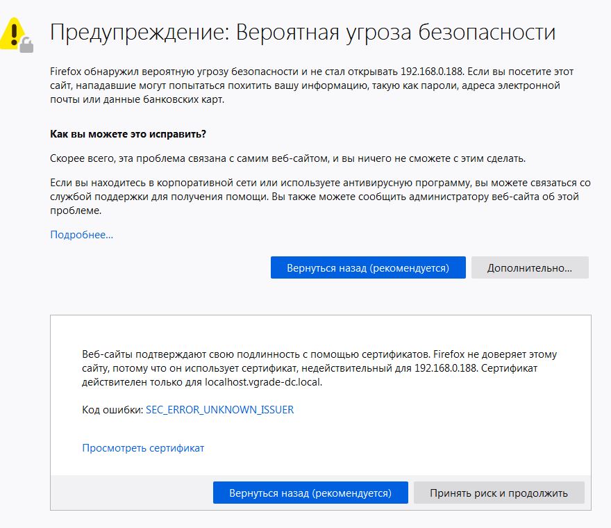 Поскольку SSL сертификат самоподписанный, то принимаем риск и проходим дальше.